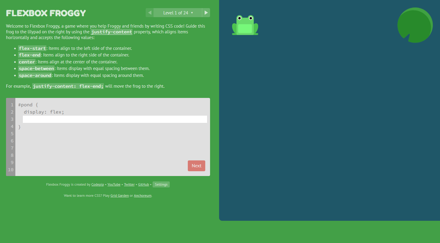 Learn the basics of CSS flexbox with this CUTE game. Help Froggy by writing CSS code!