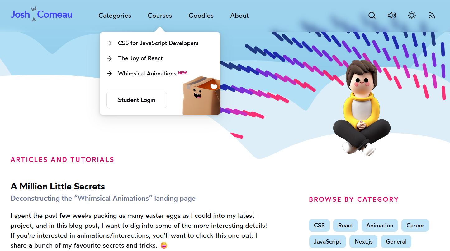 A great blog for articles and tutorials on CSS, JS, React, general web dev. Very well-made courses.